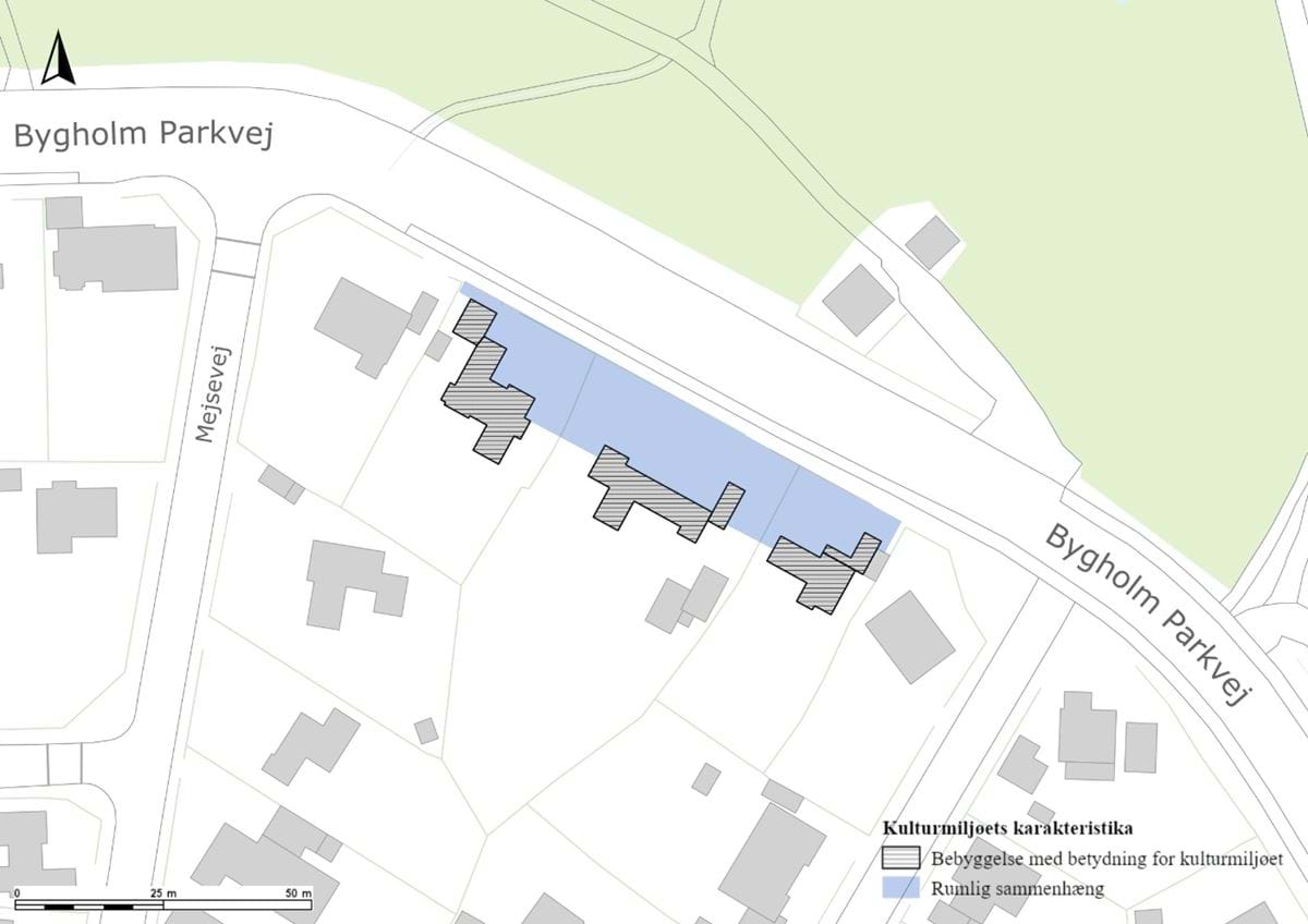Miljøet er præget af en fælles strukturel tilgang og af bevidsthed om beliggenheden ved Bygholm Park. Derfor udgør mellemrummet mellem vej og bebyggelse en særlig rumlig sammenhæng, som er vigtig for fortællingen.