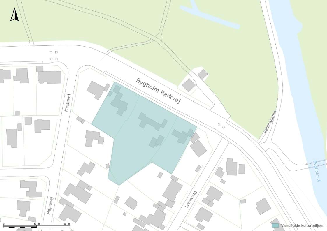 Bygninger er placeret i parklignende omgivelser. Den enkelte bygning forholder sig til helheden på samme måde som helheden forholder sig til Bygholm Parkvej og Bygholm Park.